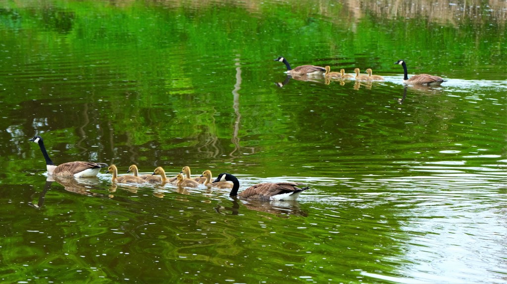 Finally, I came across two families of geese, both of which appear to have one gosling smaller than the rest. Perhaps such adoptions are more common than I realized.