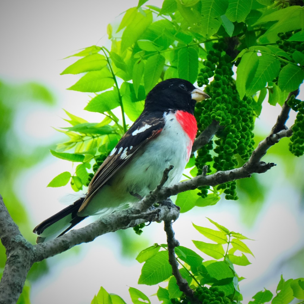 Meanwhile, here’s a male rose-breasted grosbeak calling for the female we spotted yesterday. He might want to clean up that beak before she sees it, but maybe he’s got other qualities.
