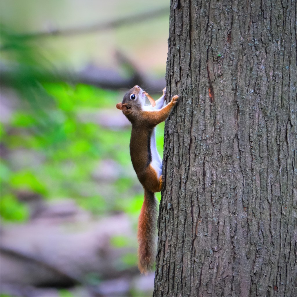 And, as if all those woodpeckers weren’t enough action, here’s a bold little red squirrel sneaking a maple tree seed from under the noses of a passel of its big grey cousins.