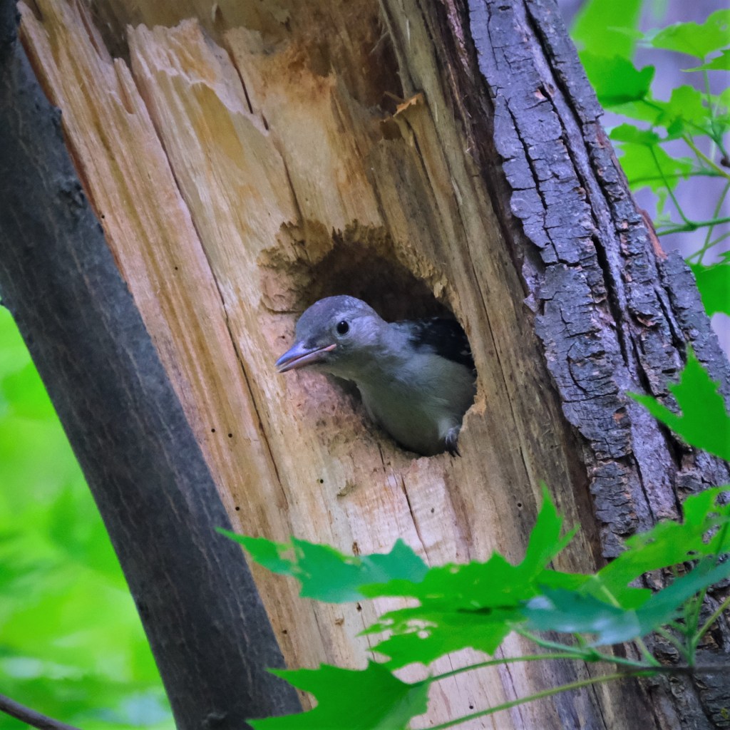 But while I was there keeping my distance and waiting for another shot, I could here both a red-bellied woodpecker calling and another little incessant chirping. Sure enough, almost right above where I thought would be a nice safe distance from the downy nest, it seems I was too close for comfort to a red-bellied nest, so I snapped this pic of a young red-bellied woodpecker looking for Mom or Dad or both to deliver its breakfast. Then I made like a tree and leaved.