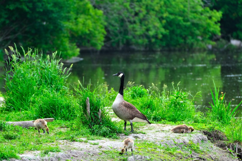 Meanwhile, out on the water, I spotted a few mallards, without ducklings today, a couple of sandpipers, and this family of geese. I actually bumped into the geese on my way north and again on my way south, and I’m pretty sure there are just 4 goslings and only 1 adult. They must have run into some serious trouble and still appear to be making the best of things. A buddy of mine from high school, Rick, had an aunt who used to say, “When you have no choice, nothing is hard,” and that seems to apply here.