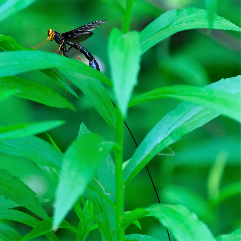 I also ran into another dear friend from last summer, this stunningly beautiful giant ichneumon wasp (Megarhyssa atrata) with an ovipositor that looks like a cardiac needle, and now that we’re old friends, I didn’t need to pick myself up off of the ground before snapping this shot. She continued north searching for hardwoods in which horntail wasps have laid their eggs, and I continued south.