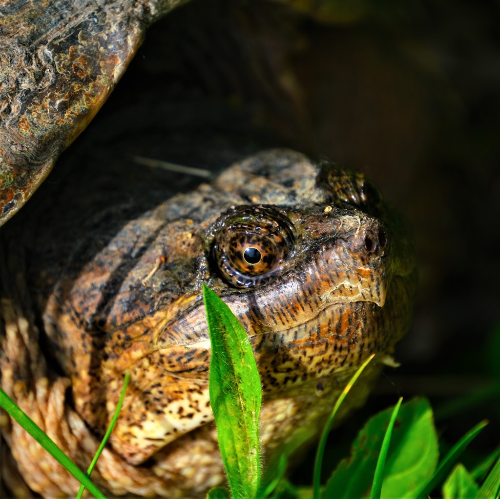 Finally, thanks to a tip from Kate B., a fellow birder and frequent park visitor, I knew to look for this magnificent creature, a common snapping turtle (Chelydra serpentina) of good size, who appeared to be making his or her way to the river. I’ve seen how far they can reach with their razor sharp beaks, and I didn’t have a snow shovel handy, which I used to keep in the trunk of my car all summer for just such purposes in upstate NY, so I did not offer to help with the journey as I could with the red-eared slider last summer.
