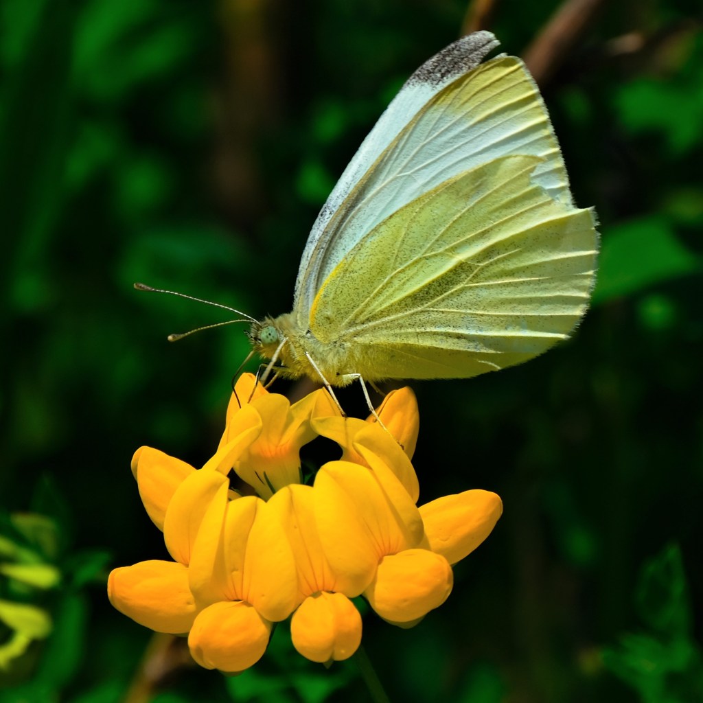 Here’s a cabbage white on a nice, bright yellow bird’s-foot trefoil (Lotus corniculatus) blossom beside the river. There was another cabbage white in the vicinity, and things looked they were going to heat up for a second, but I had my shutter speed set too slow to capture the action, and the second one went its separate way again before I could adjust. Dang.