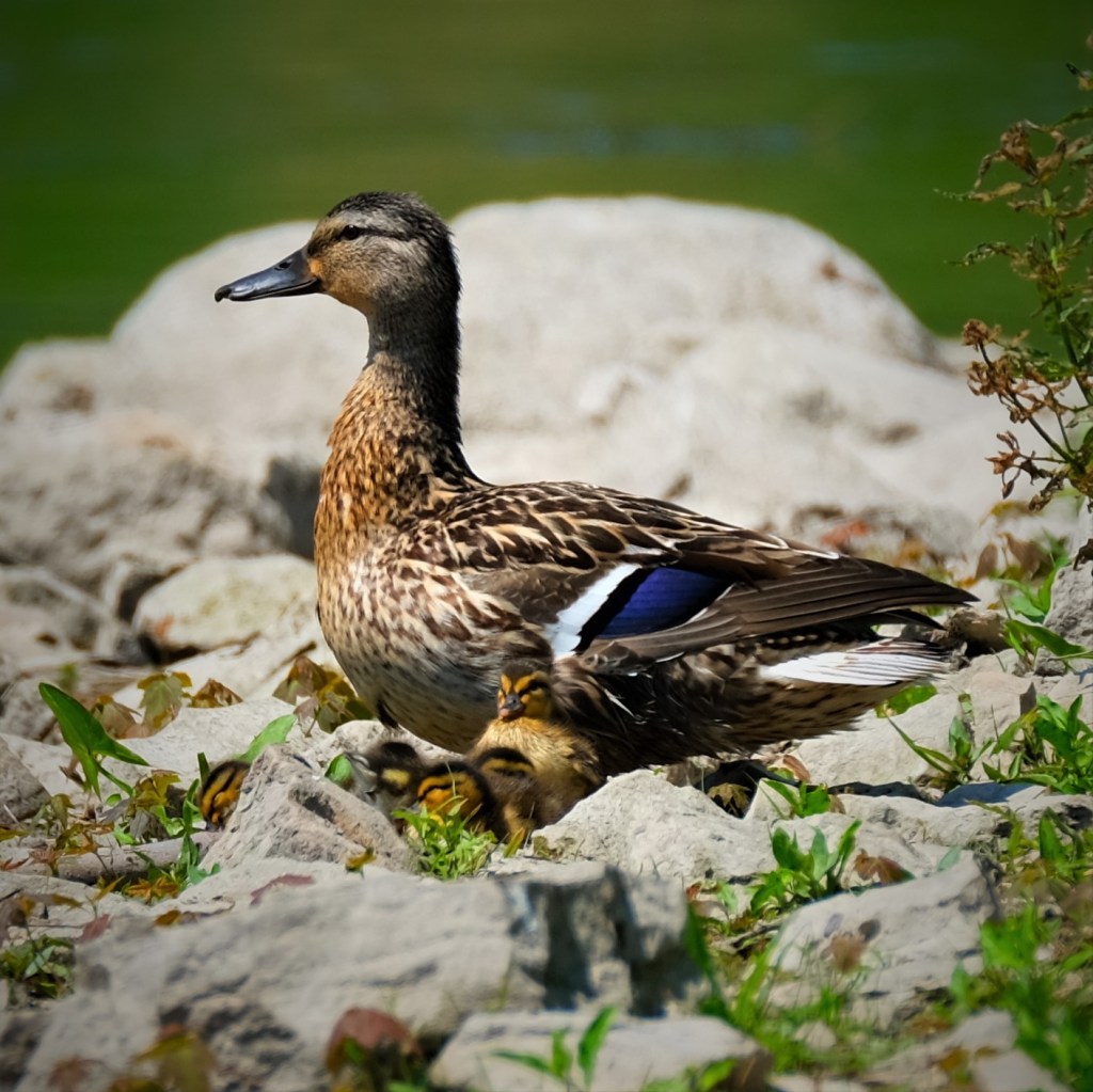 The river was still loaded with Canada geese and mallards, and here’s a mallard hen keeping watch while her ducklings are supposed to be taking their morning nap.