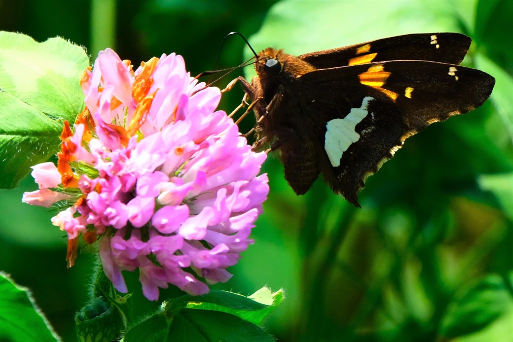 Let’s start with our first sighting for the season of a silver-spotted skipper (Epargyreus clarus), sipping from one of the few red clover Parks hasn’t yet mowed in what I used to call the wild flower meadow at the north end.