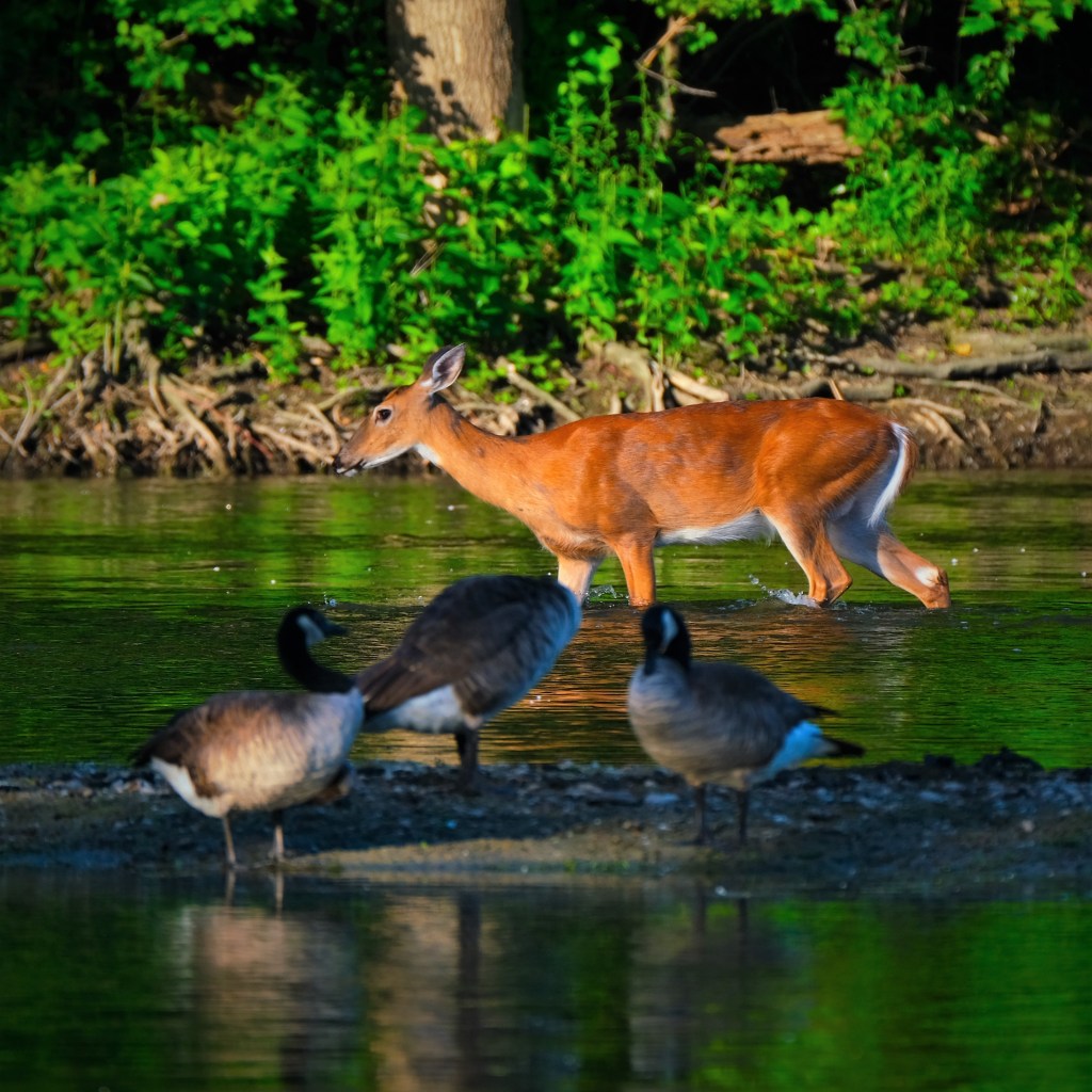 I got to the park a little earlier than usual, and when I visited the pond, there appeared to be nobody home. Oh sure, I could here the frogs and see the fish nibbling on bugs at the surface of the water, but there was no heron, the muskrat stayed hidden, and I couldn’t find the wood ducks. I figured maybe it was just their time to head down to the river like the geese and goslings just over three weeks ago, and so I joined them.