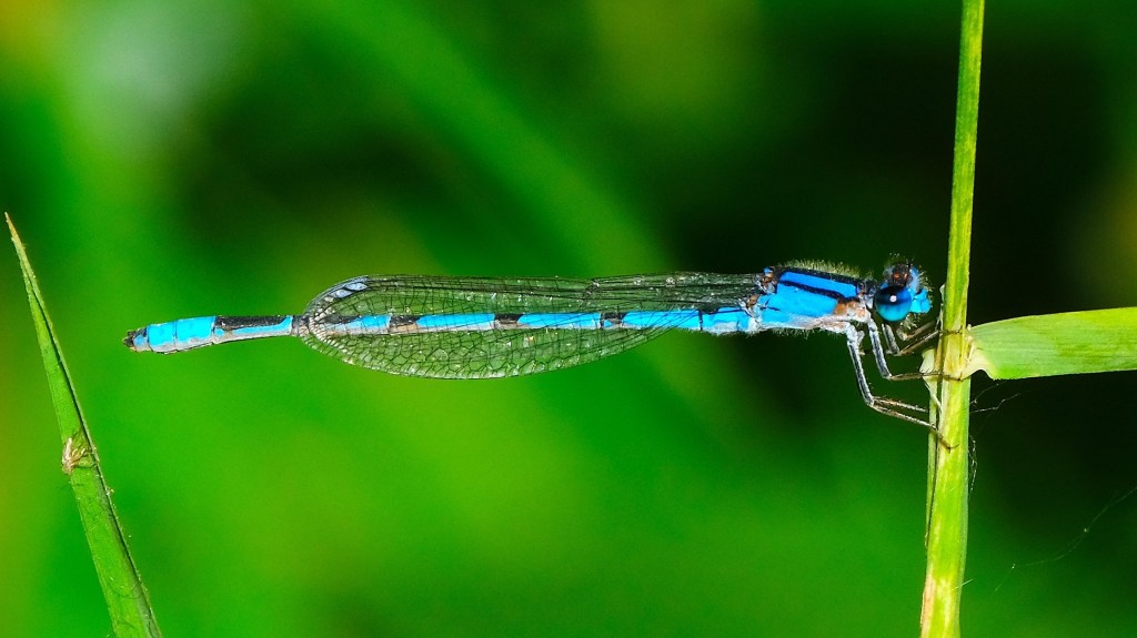 On shore, I found the damselfly basking in the sun. If I had to guess, I’d go with (Enallagma cyathigerum) know variously as common blue, common bluet, or northern bluet.