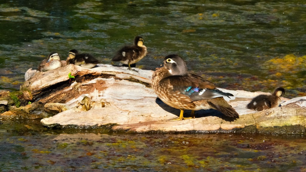 It was still plenty early and the park shouldn’t be full of market goers yet, so I swung by the pond again just in case, and this time, the ducklings convince Mom to join them for a break on that log.