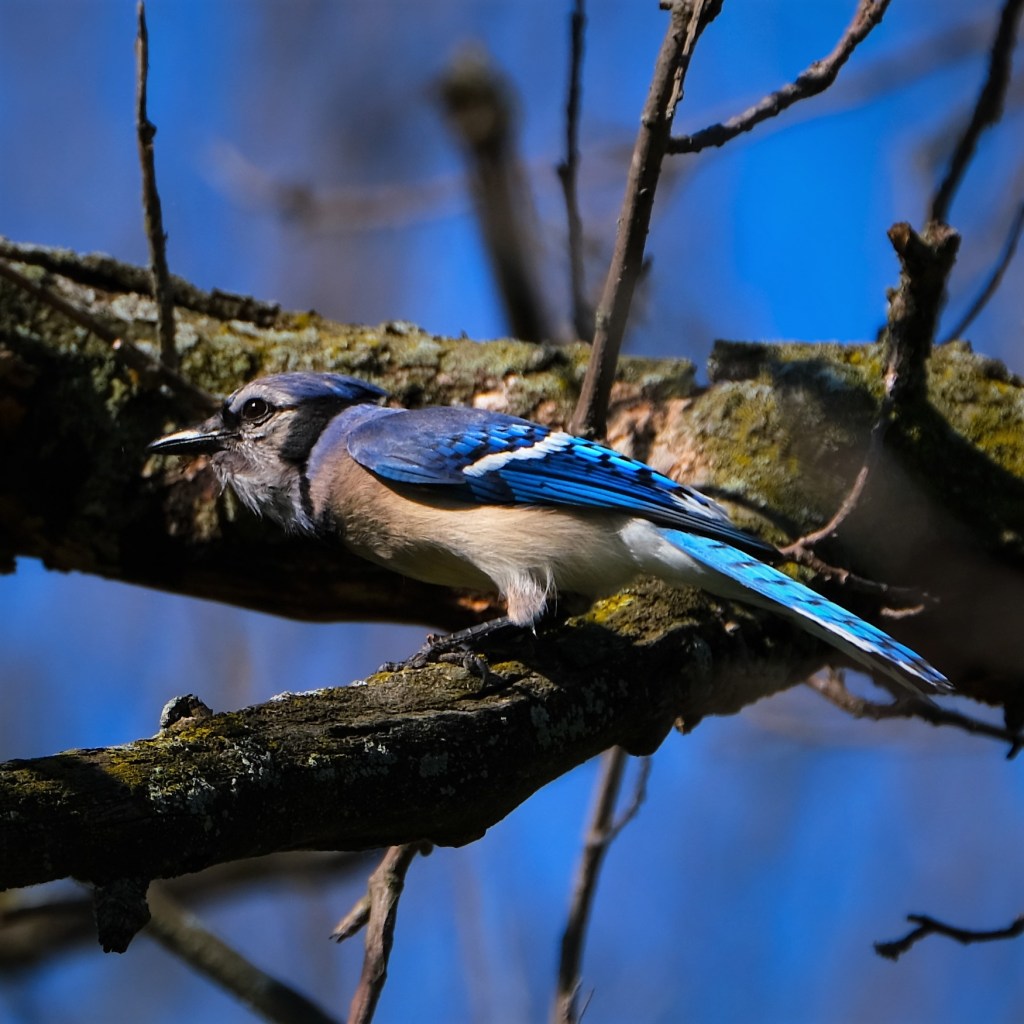 On my way home, at the soccer fields, I found a blue jay less shy than usual, or just too intent on the hunt to worry about li’l ol’ me.