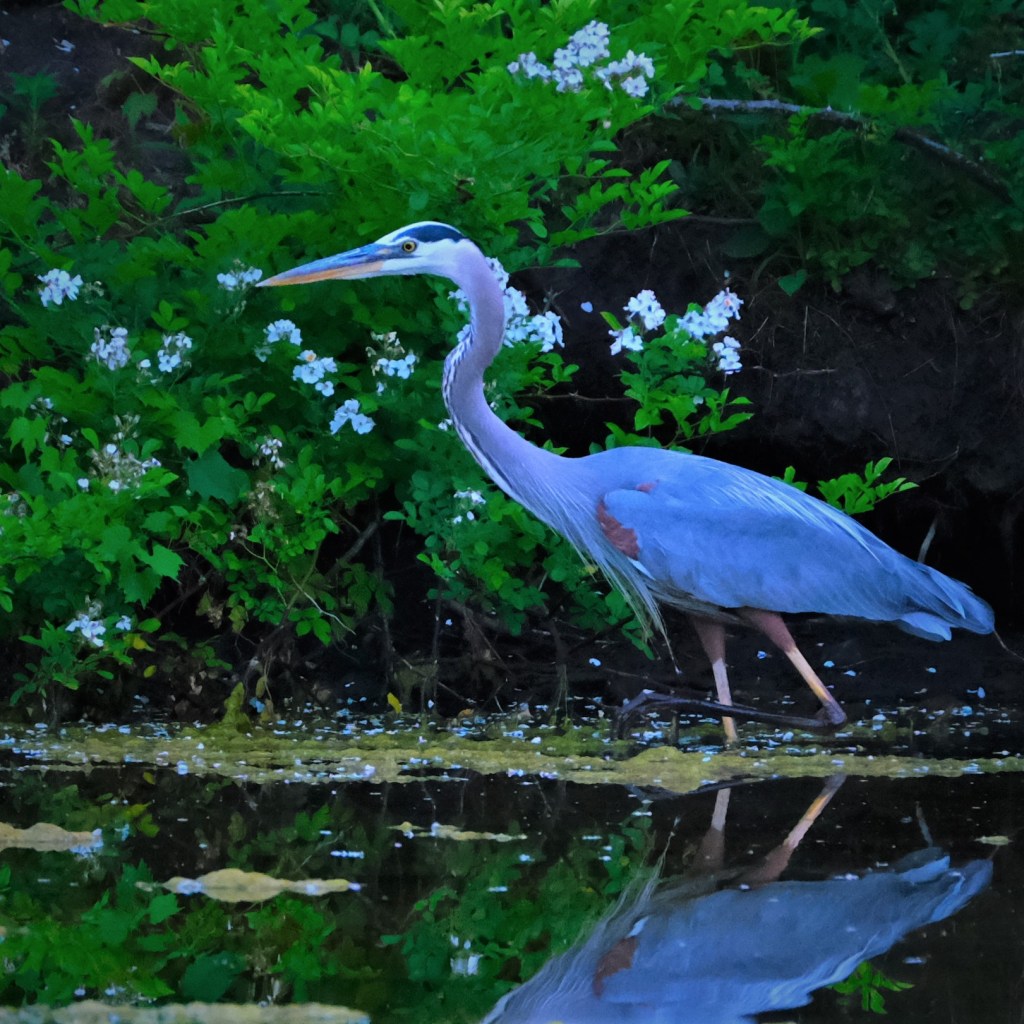 The stunningly beautiful morning got off to a picturesque start when this great blue heron on the pond paused in front of a rose bush on the island, probably the same multiflora rose (Rosa multiflora) that we saw last week, instead of behind a bunch of dead and gray sticks.