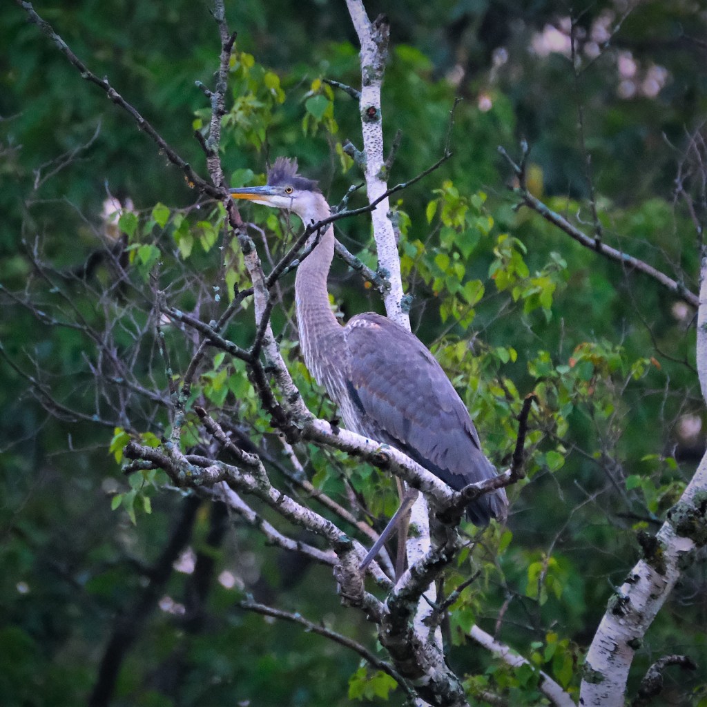 The usual contingent of ducks and ducklings were about, but still no raccoons. Maybe they’re taking a little break from crayfish for breakfast. We did have one young blue heron, however, still experimenting with “hairstyles” it seems, up in one of the birch trees along the east shore.