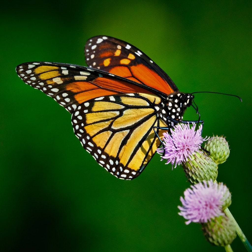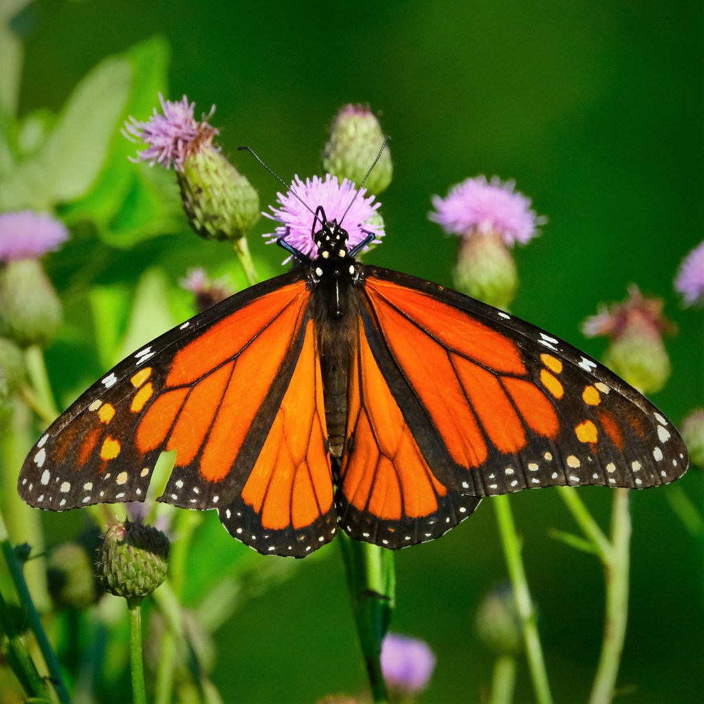 At the weeds, sure enough, there were two monarchs. One flew off right away, but the second must have still been hungry for some of that sweet, sweet Canada thistle nectar.