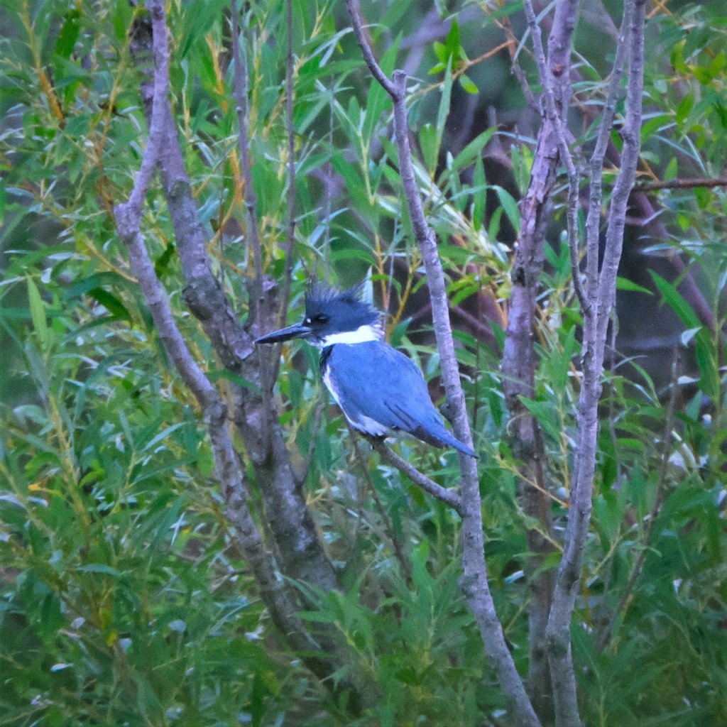 This morning was sort of a mixed bag. The weather was beautiful, but the pictures got off to a slow start. There were even a few mallards at the pond, when I arrived, along with the wood duck hen and ducklings, but nobody was feeling very photogenic, so I let them be. There was also one male belted kingfisher, but they’re very skittish, and this is the best I could do. No raccoons again today.