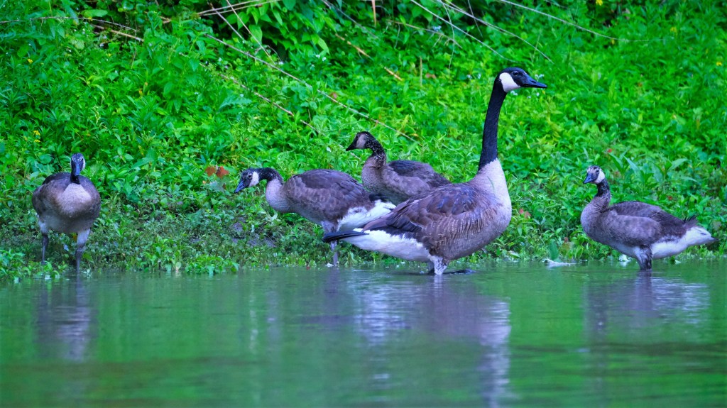 Above the falls, I finally found a nice grouping of geese that shows off how far the goslings have come. The big one in the middle and keeping its eye on me is the adult.
