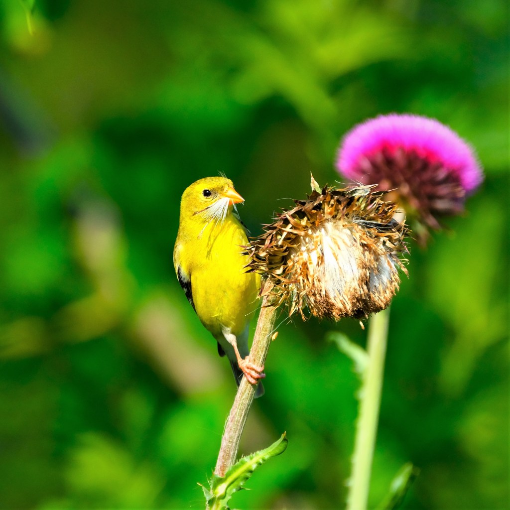 Another goldfinch, a female this time, was feasting on a bull thistle blossom.