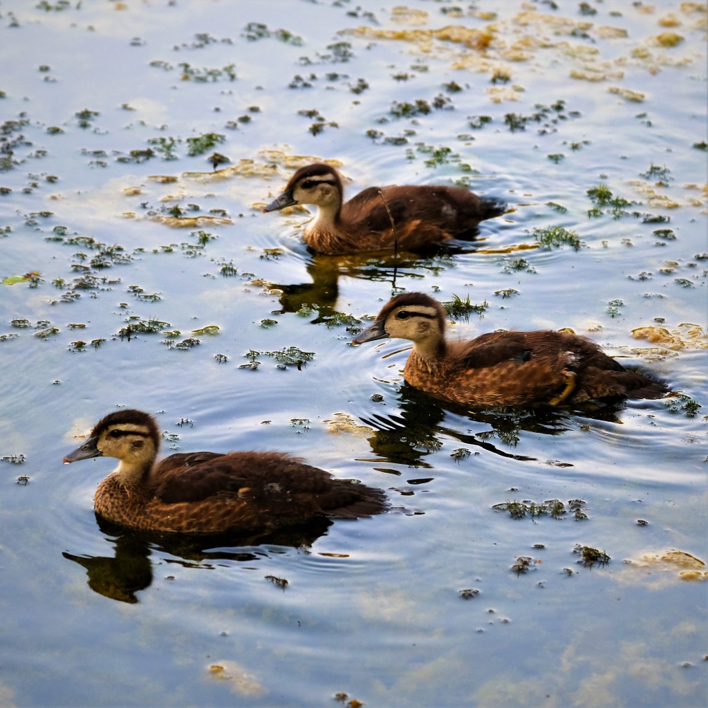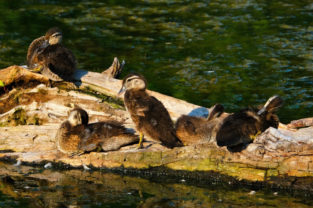 I stopped by the pond again on my way south, and a green heron evaded me, while the ducklings settled down for their early morning nap.