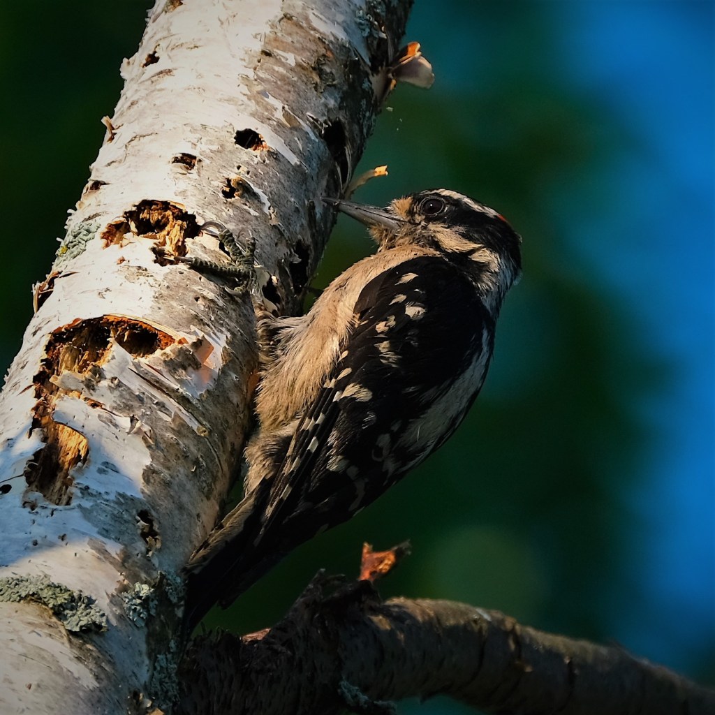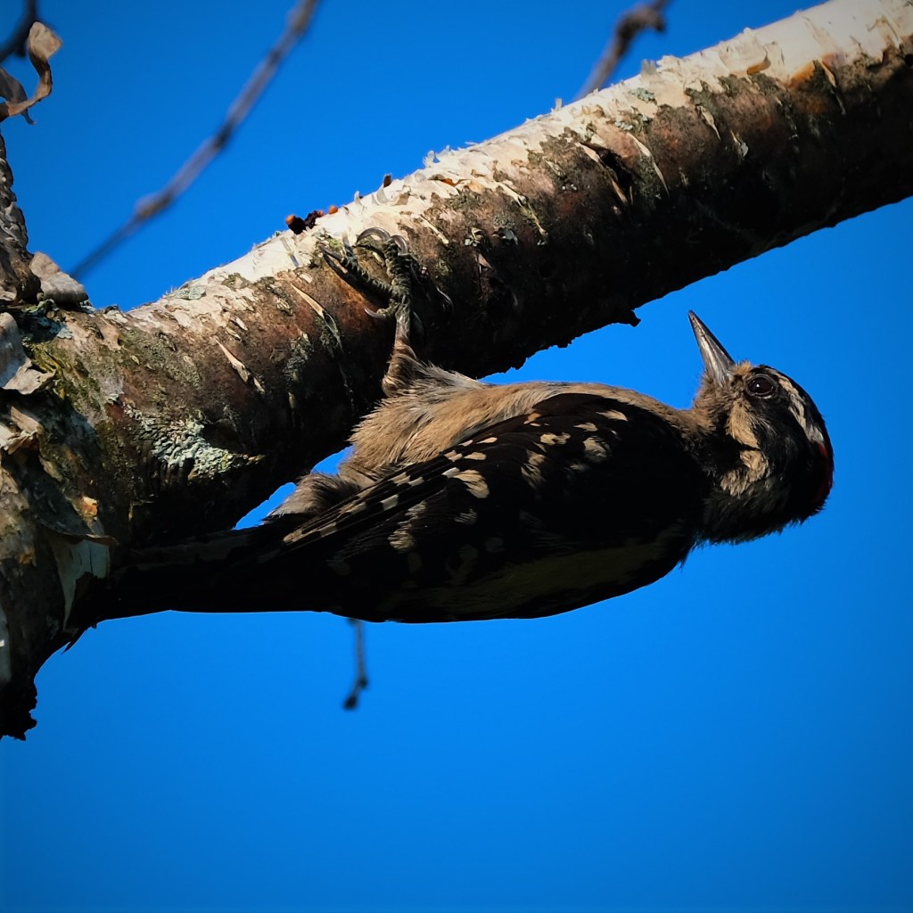 On the next birch tree over, there was a woodpecker that looks like a female downy, but with grey feathers instead of white. She even has the couple of little black squares in the white stripe down the side of her tail. Curious. I don’t think it’s some effect caused by my camera because the birch bark is nice and white.