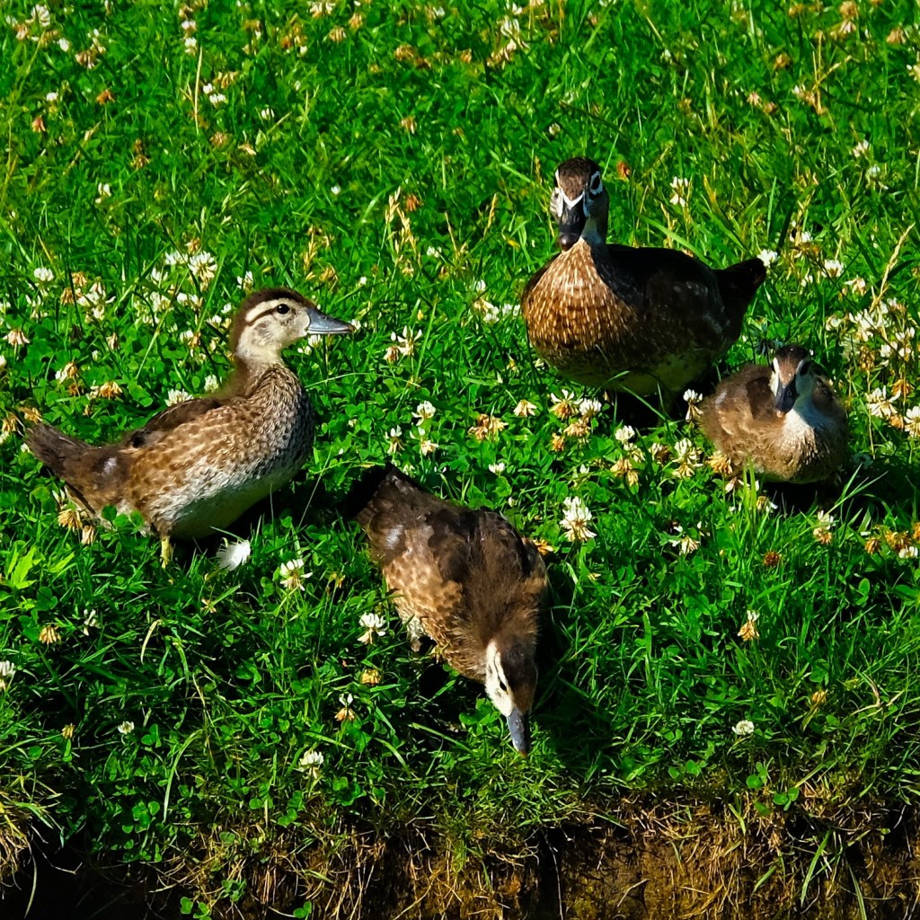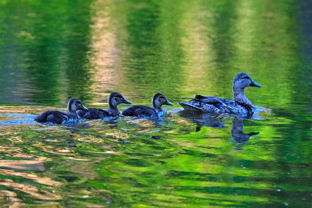 This morning really got off to a slow start, and I’d be tempted to think that the heat had something to do with it, but who knows. I didn’t see anything on my way to the pond, and there I only saw the same regulars that we saw just yesterday, so I headed to the river, where I almost made it to the north end before I even turned my camera on. At last, the mallard hen with three ducklings led them through a pretty reflection of the trees on the island lit by the sun.