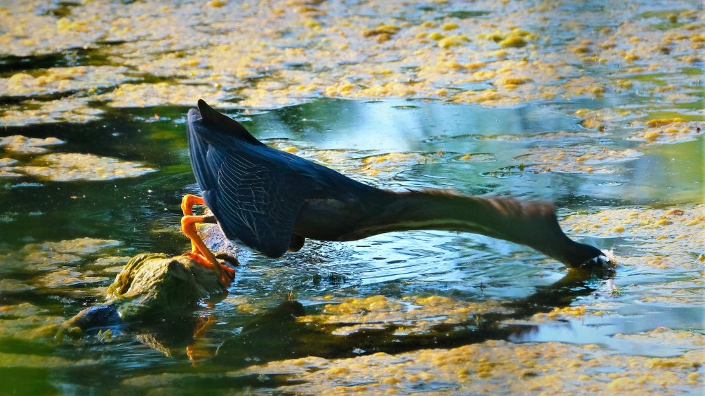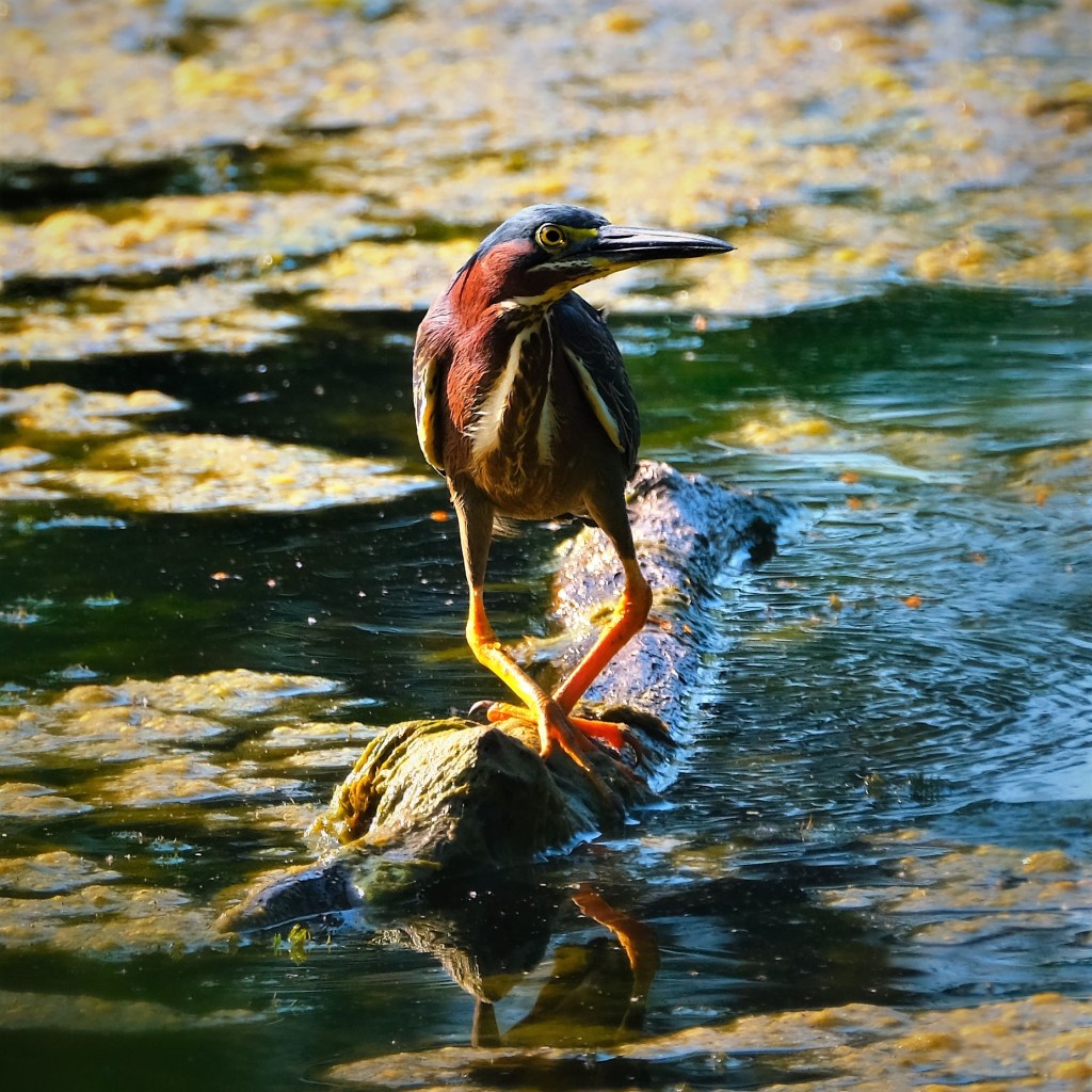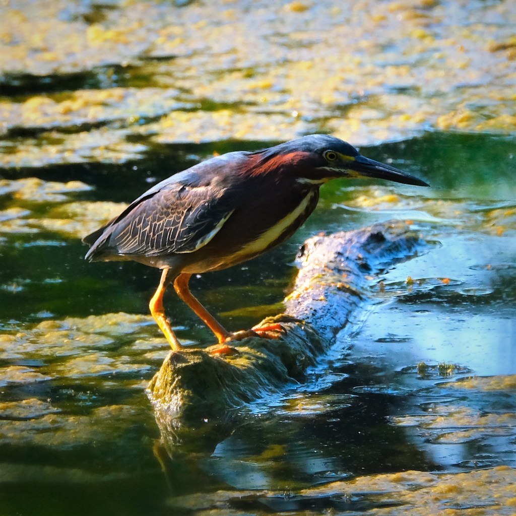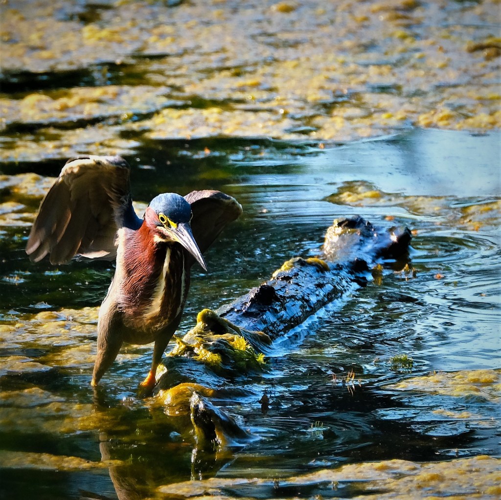 Yup, one of the green herons that have really been giving me the slip lately. It was on quite the roly-poly little log and appeared to be having a heck of a time staying upright but not so much that it couldn’t snag a little fish anyway.