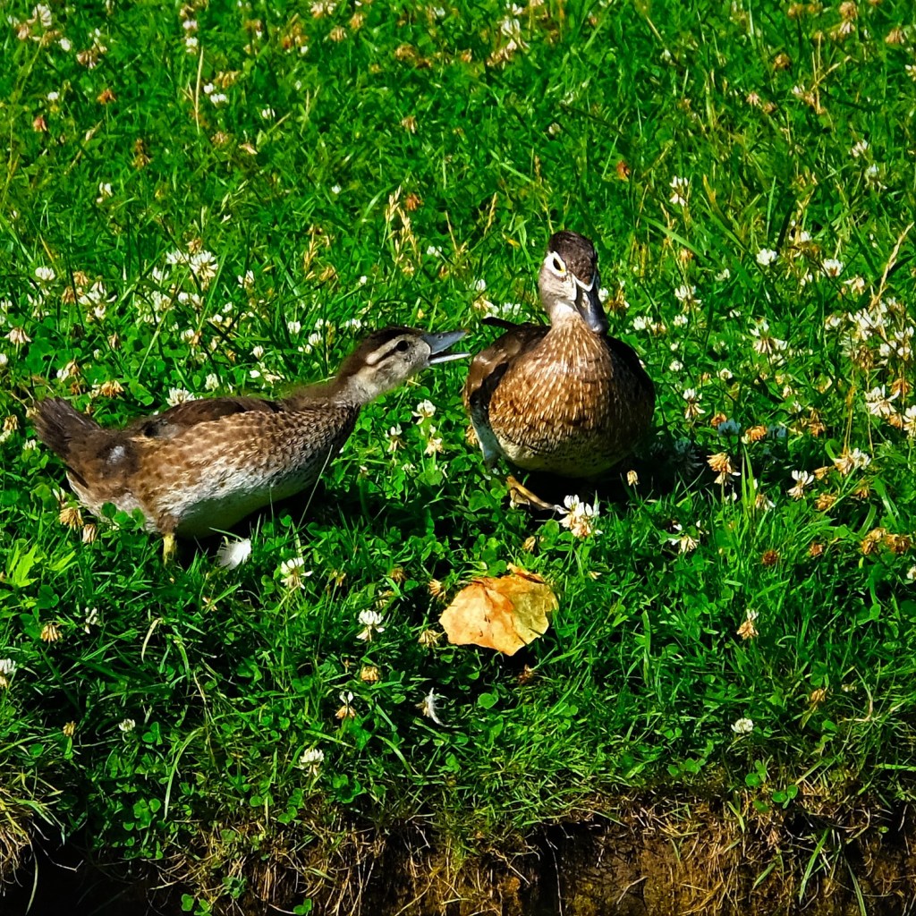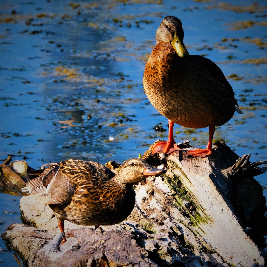 Meanwhile, the American black duck hen and her best buddy the mallard hen were enjoying their morning preen together in the sun.