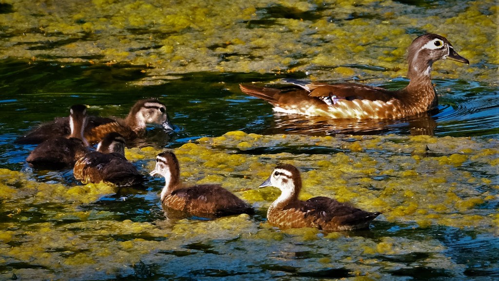 I didn’t see Mrs. Wood Duck’s new special friend, so she was giving the ducklings some attention, for a change. First, there was a winding cruise through the algal mats.