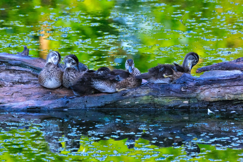 Once I did arrive at the pond, the sun did not disappoint. The wood duck ducklings were lounging in the shade on the east side, but the trees and bushes behind them were alit and reflecting beautifully off the water.