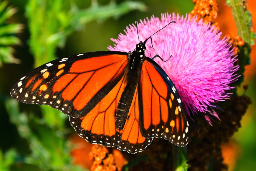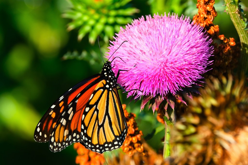 And here are a couple of shots of a monarch, of which there were several I am thrilled to report, gettin’ juiced up on a bull thistle blossom.