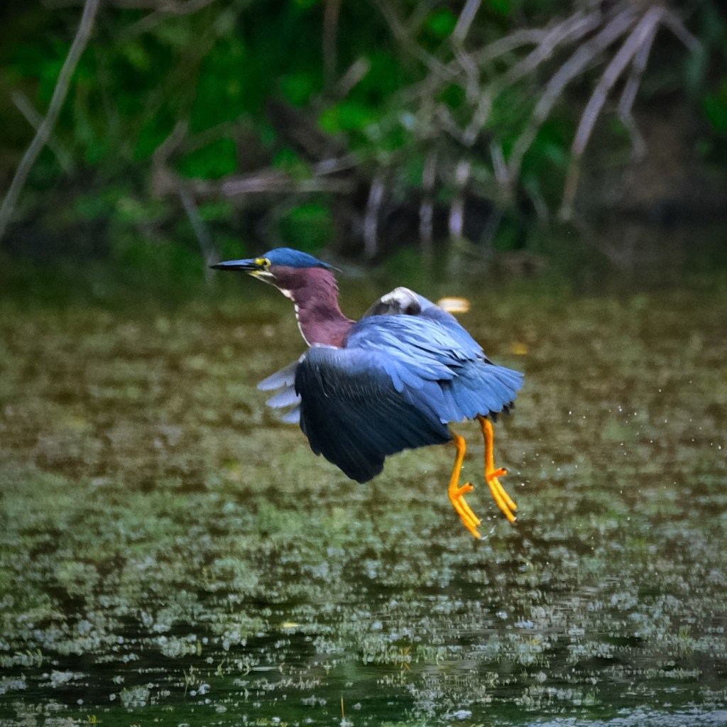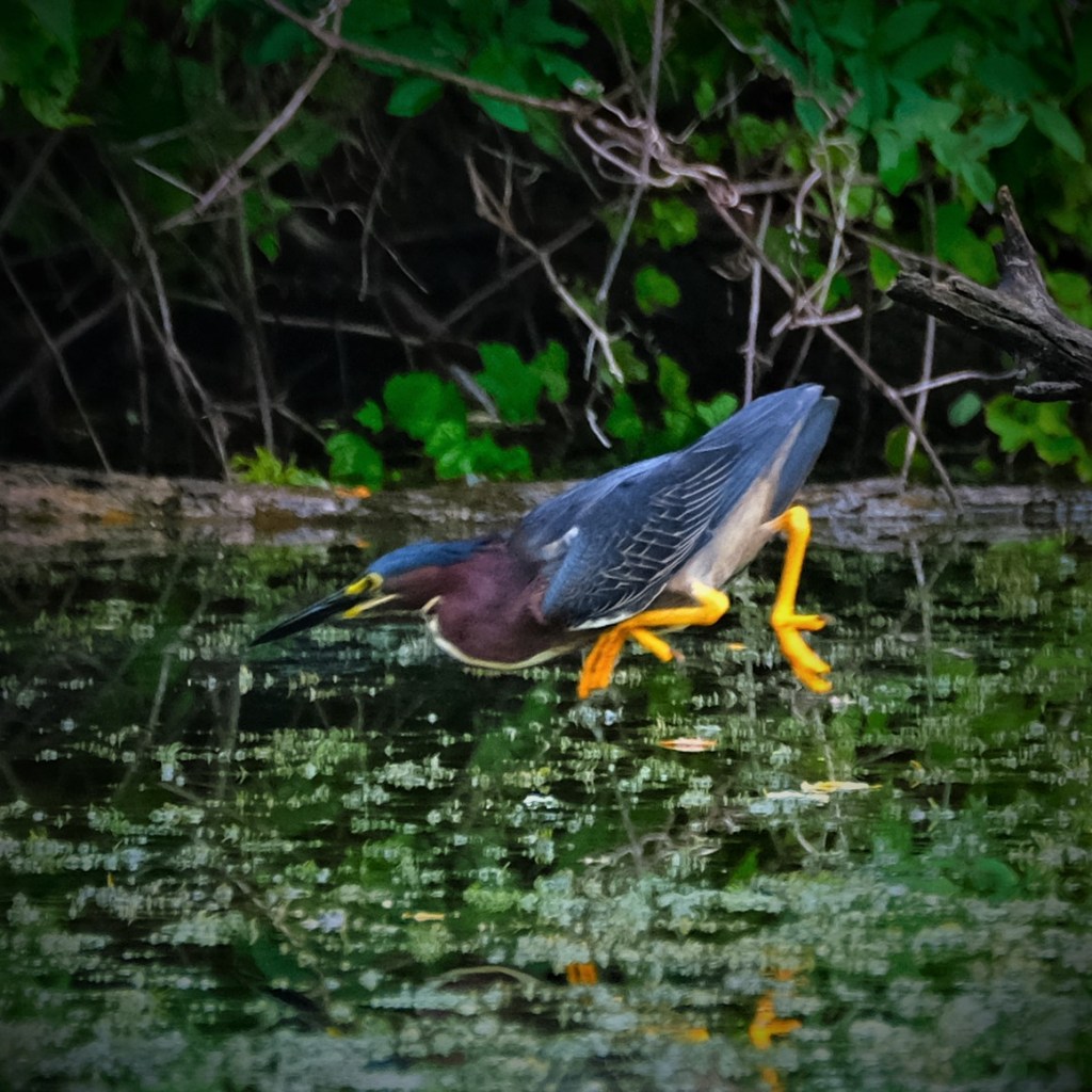It was one of those mornings that remind me that “10% chance of rain” often means “steady rain, but just at 10% intensity.” The good news is that the continuous spritzing didn’t slow down the critters in the park, and there were at least three herons ont the pond, one blue and two green.