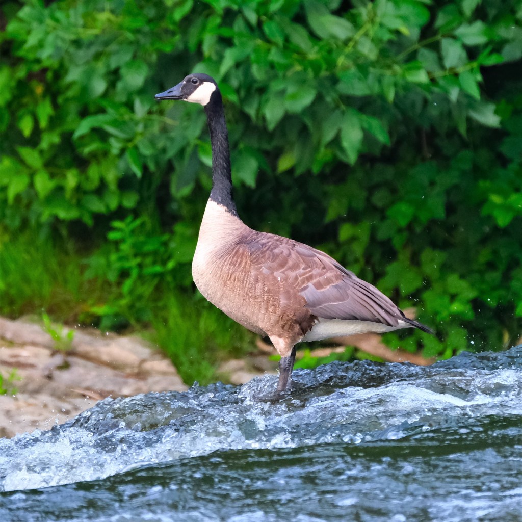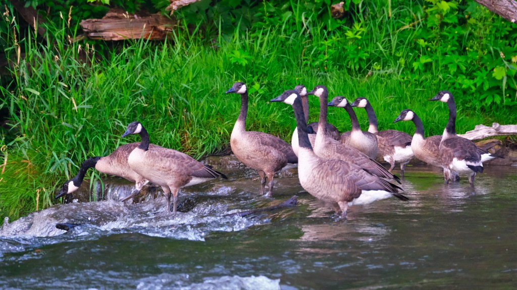 I didn’t see any sandpipers today, at the falls or elsewhere, but I was fascinated to watch a large gaggle of geese negotiate a group decision to go over them. First, they all approached, then most of them headed back up river, and then finally, the yeas carried the day.