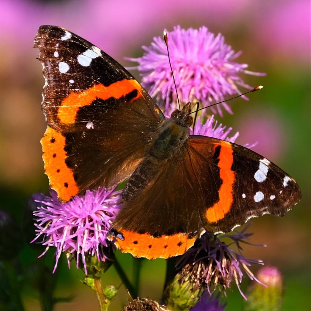 With the sun out, I thought I’d catch a pretty butterfly on a pretty blossom to show you, but I was disappointed until right at the southern exit to Wilson Drive. There, tucked down low and in the back of the big stand of Canada thistle that grow there, I found this beauty sunning itself while it sipped nectar. Long-time readers may recognize this as a red admiral (Vanessa atalanta), which we saw several times last summer, but not yet this summer until right now.