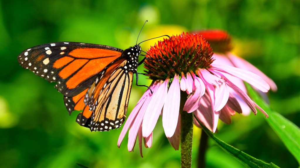 As did this slightly-roughed-up monarch on a purple cone flower at last.