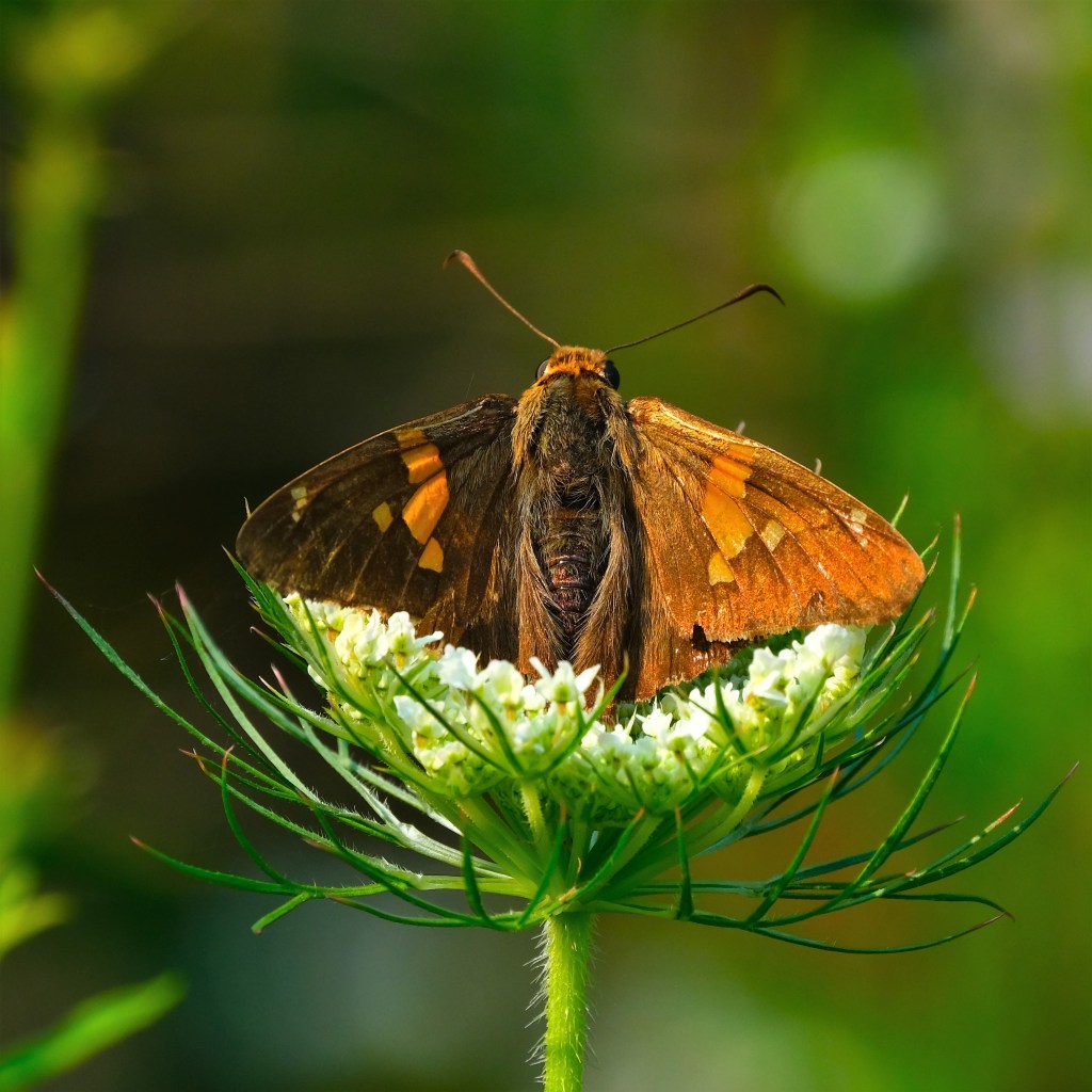 Meanwhile, in the meadow, a silver-spotted skipper appeared to sunbathe in this young Queen Anne’s lace blossom.