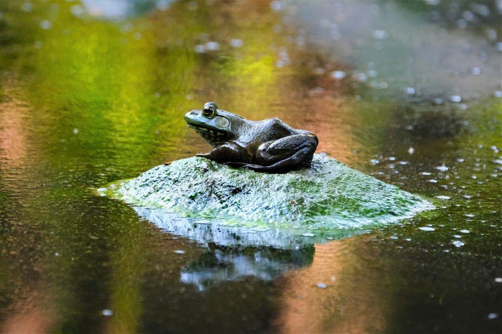 Back to this morning, on my way south along the river, I spotted the bullfrog, chillin’ picturesquely on a rock in a little side backwater.