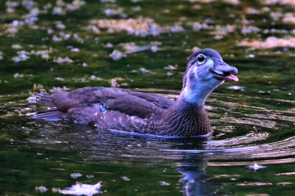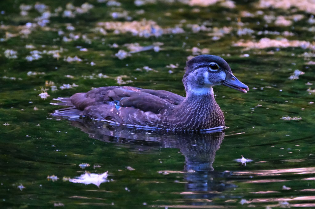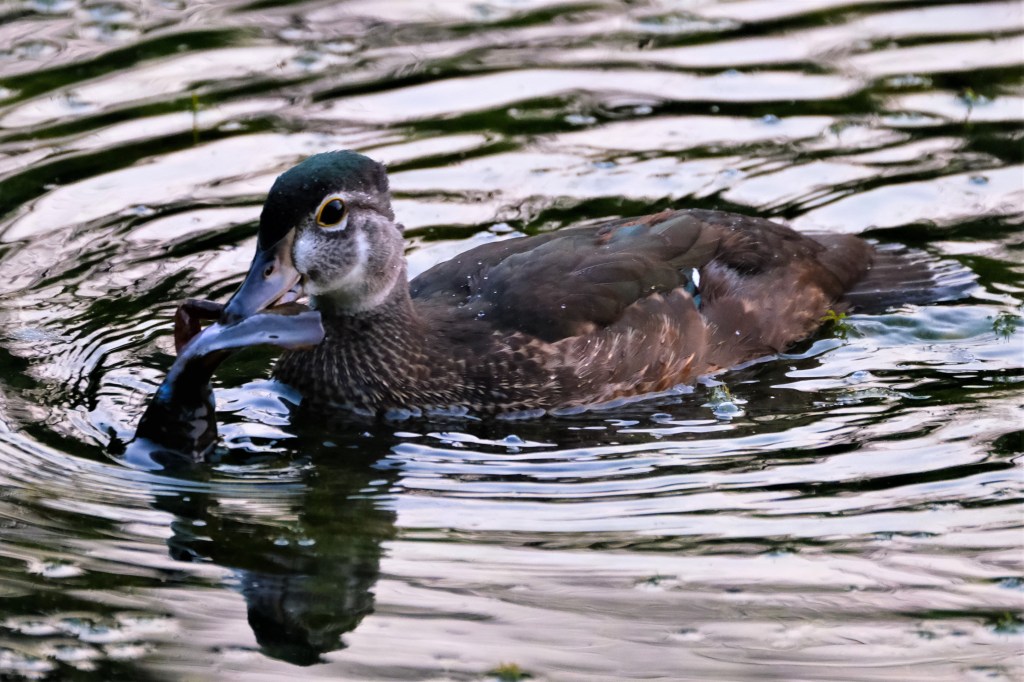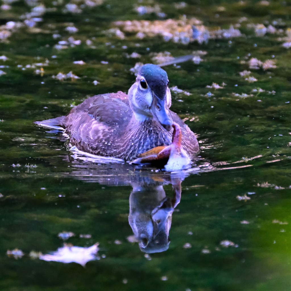 I could see a blue heron in the bushes at the north end of the pond when I arrived this morning, and as I tried to make my way around to a better viewing angle, I was treated to the spectacle of this little omnivorous wood duck duckling, almost all grown up, scarfing down a pretty good-sized frog it had managed to catch.