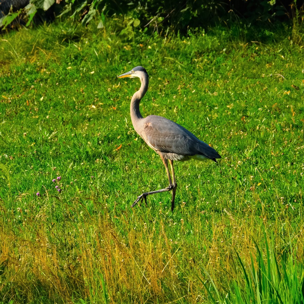 Back at the pond, the blue heron was out of the bushes, and checking out what the ducks are always finding up on the west lawn.