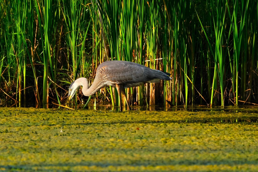 And finding no fish, frogs, or crayfish, it continued south to the reeds on the west side, where it did find what appears to be, based on the tail, at least one little fish.