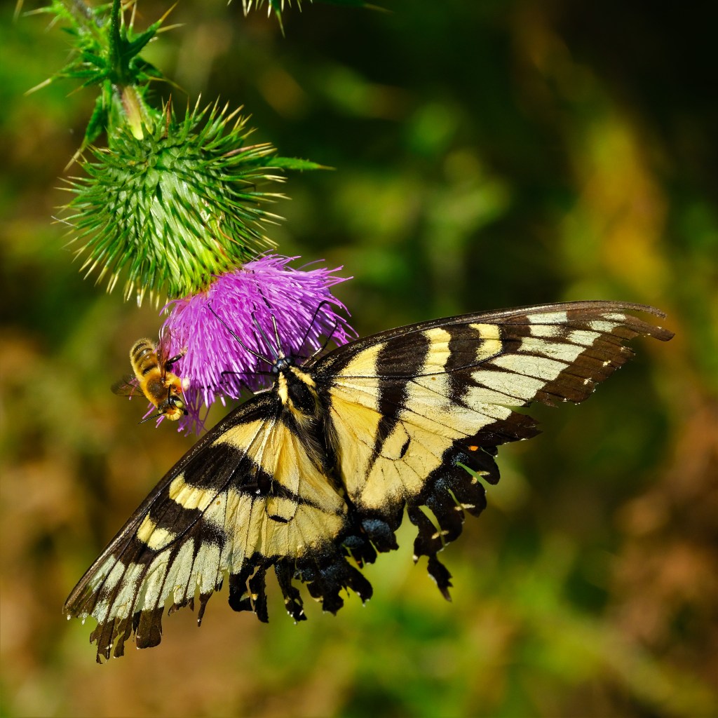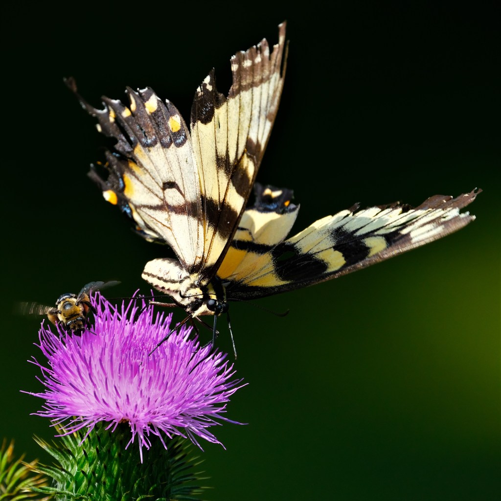 Lastly, because I’ve been looking for that swallowtail for so long, here’s just one more image, with one more bee, of course.