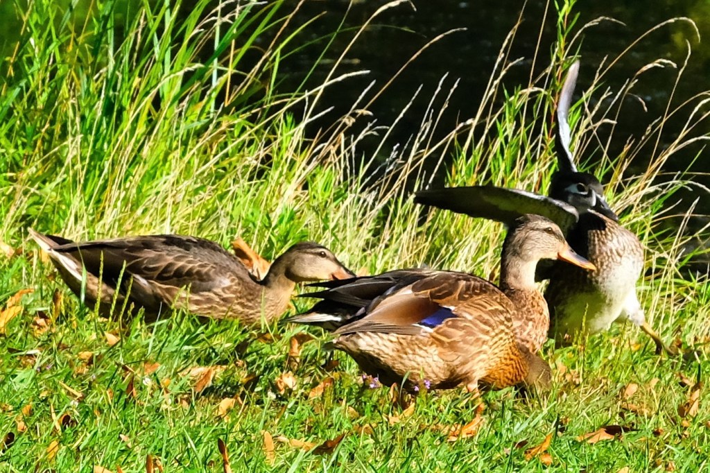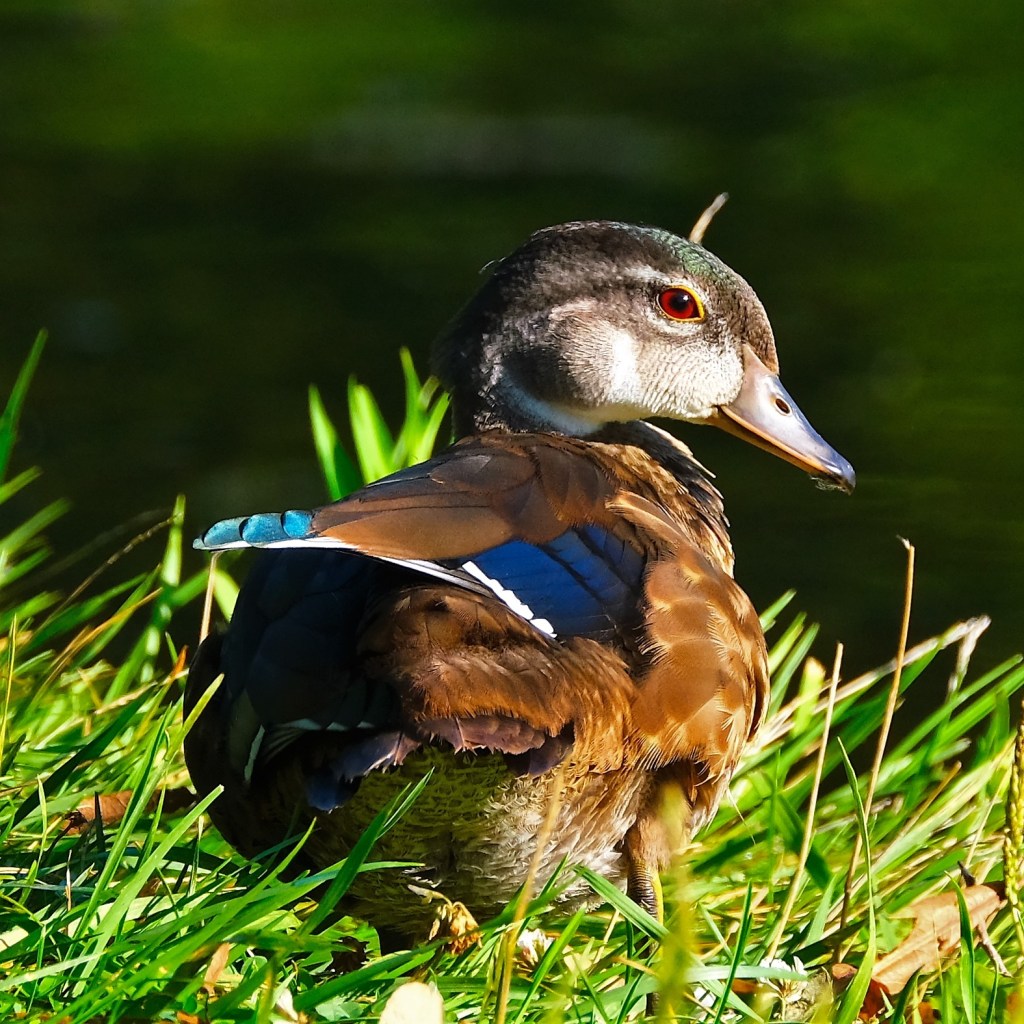 And here’s a wood duck just enjoying the beautiful weather, perhaps, and showing off its pretty new adult flight feathers. They haven’t been chowing down on frogs and crayfish all summer for nothing.