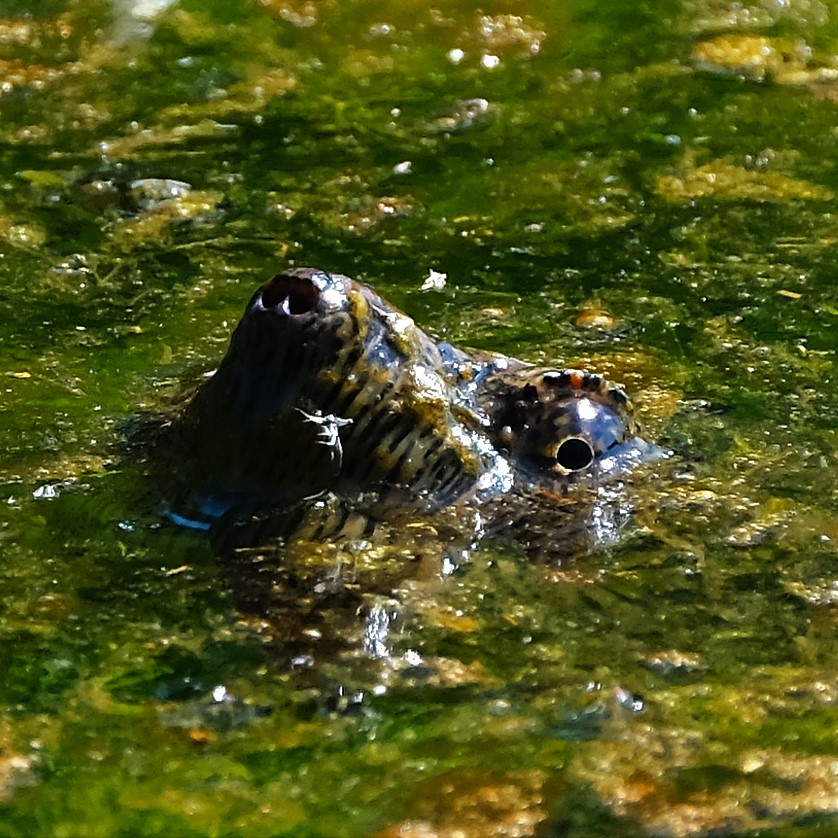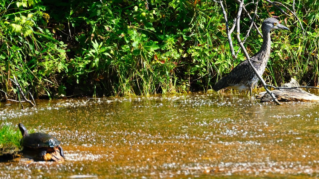 Then I scanned the rest of the pond, and spotted another turtle, but as I tried to get a picture of it, look who was lurking in the background. Ha! It’s the young night heron again.