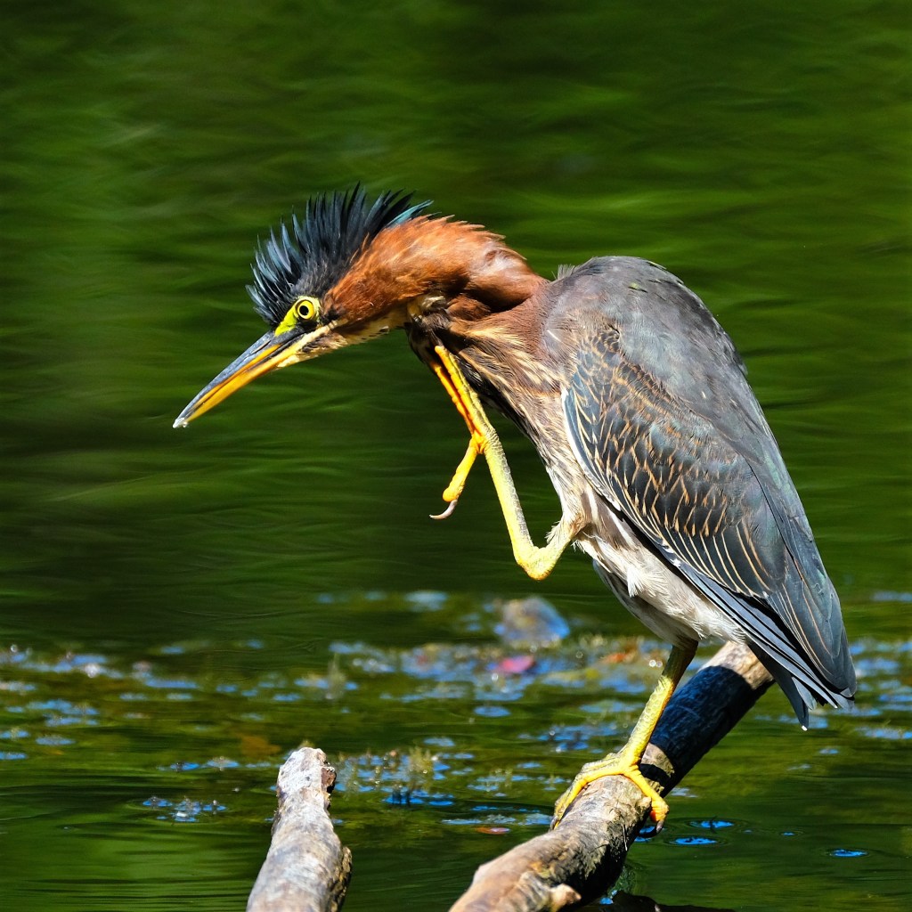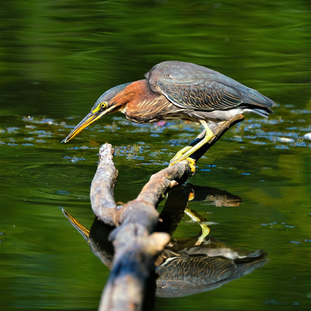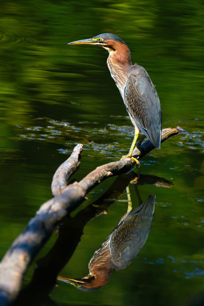 Finally, as I continued south, I spotted a green heron fishing in the southeast corner of the pond. I took a couple of shots from the west side, but the sun was still in the east so the light was bad, and I know there’s a little path down to the water in that corner, so I walked around to see if this heron would let me get that close.