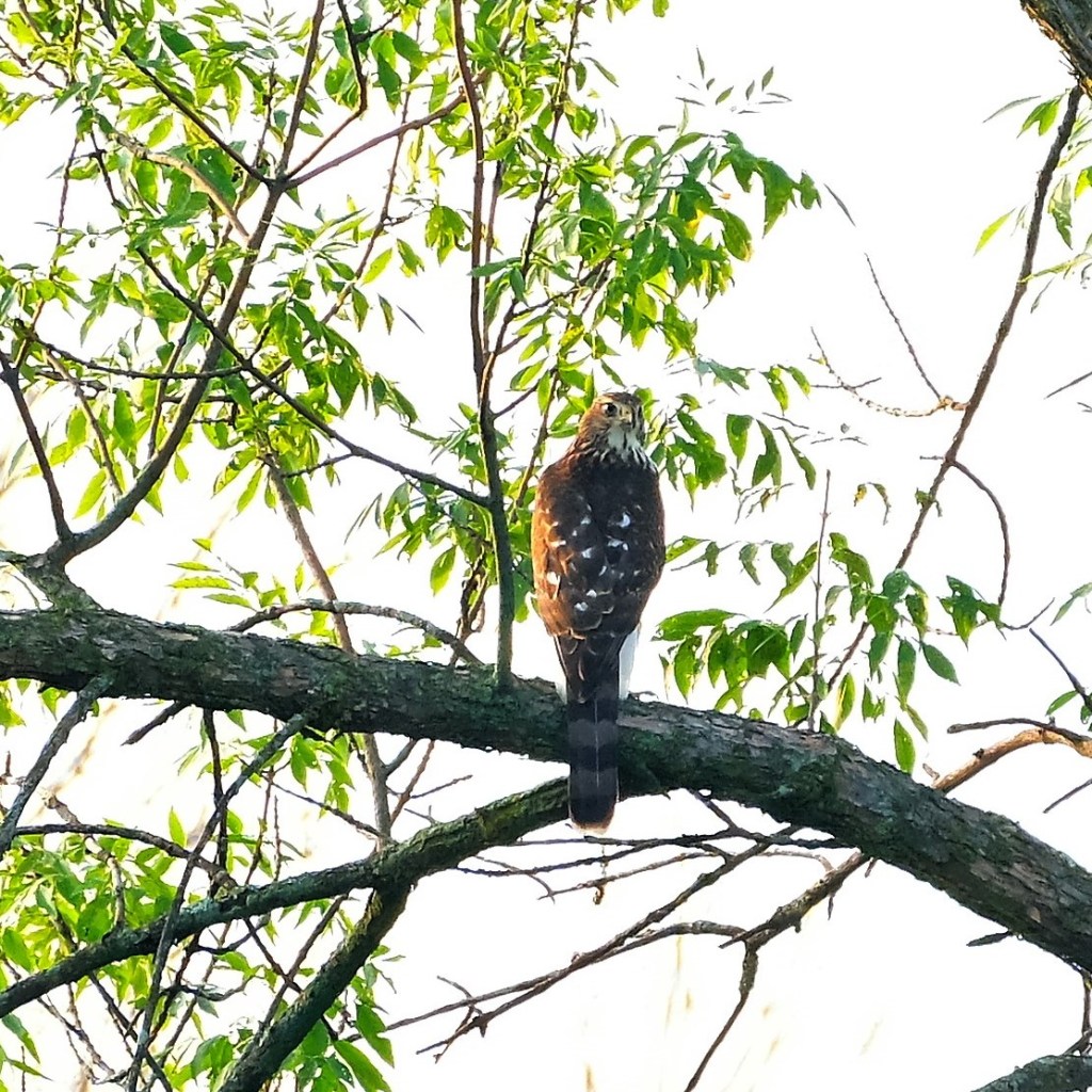 Then, as I started to make my way around the north end of the pond to check on the east side, all heck broke loose. The herons took off, a wood duck quietly slipped off a log into the water, and a kingfisher started circling the island sounding its distinctive alarm. Luckily, the instigator of all this agitation wasn’t me for a change. Instead, it was a Cooper’s hawk swooping over the pond, and it stopped in one of the tall ash trees at the south end so I could make this record of the event.