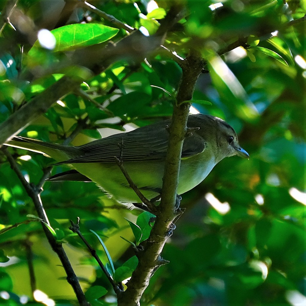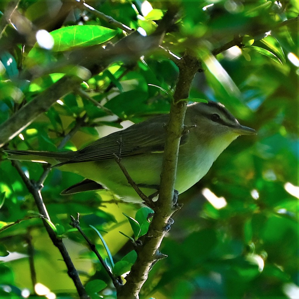 Lastly, on my swing back by the pond to see if anybody new had shown up, I managed to catch this quick-moving bug hunter deep in the bushes at the north end, and that distinctive black-and-white eye striping makes it a red-eyed vireo, I believe, even though we can’t make out the red eyes. It’s got even farther to go than the magnolia warbler, all the way to the Amazon basin, and I expect it will be on its way soon.