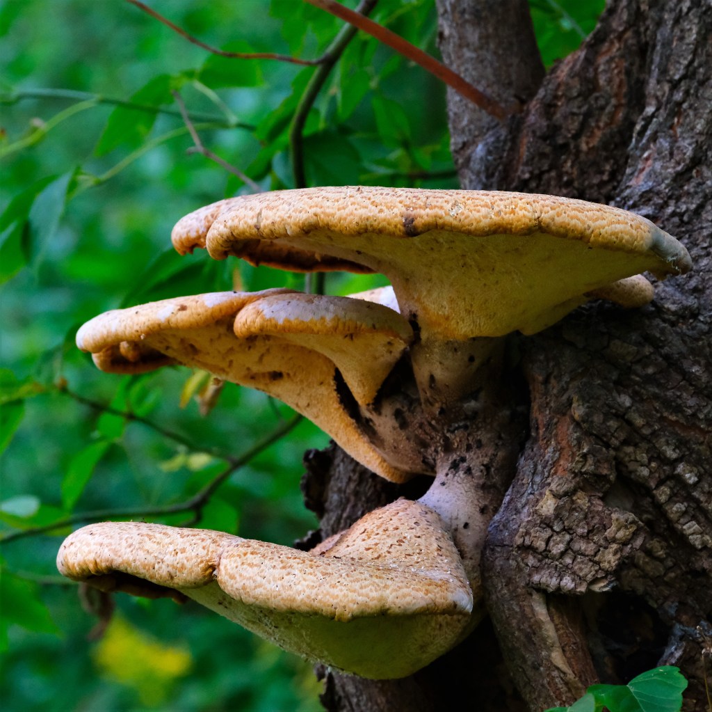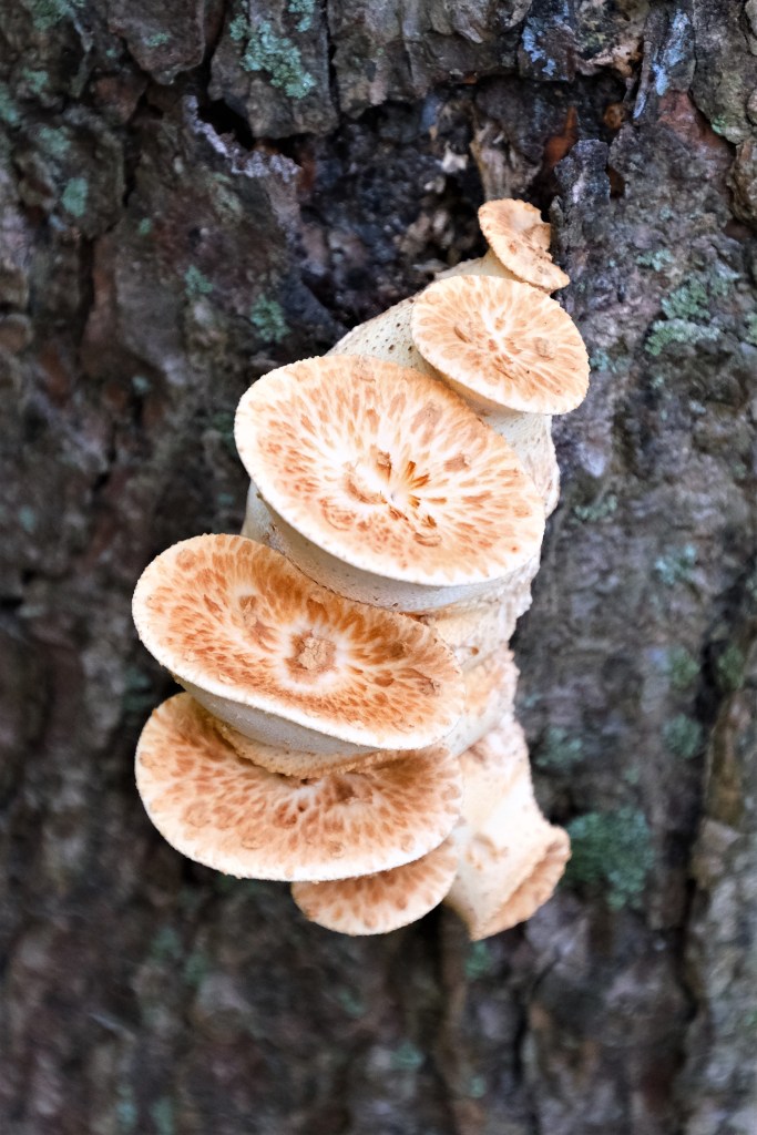 Finally, several dryad’s saddle mushrooms, aka pheasant’s back, are in various stages of development. Here a couple by the boardwalk in their early, pig-nosed stage.
