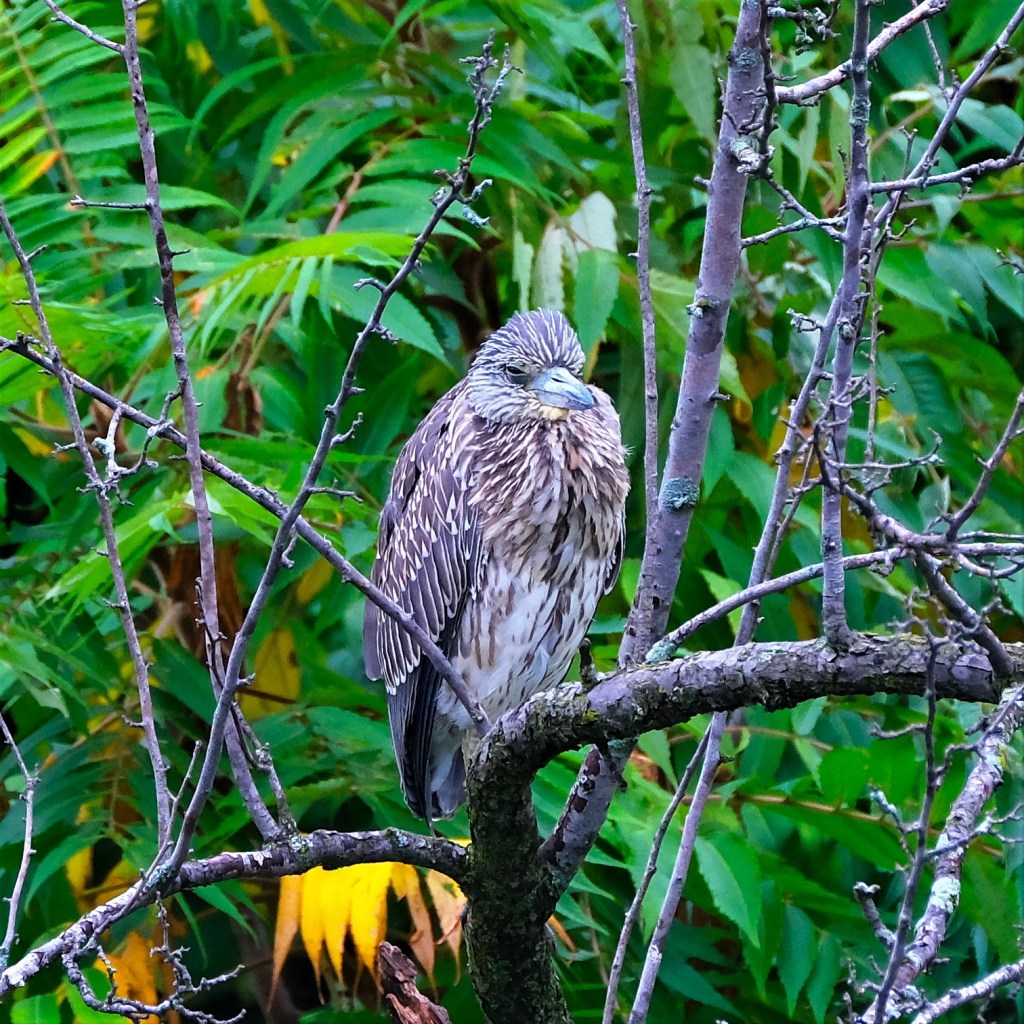 At the pond, the young night-heron was back and nodding off near its usual spot.