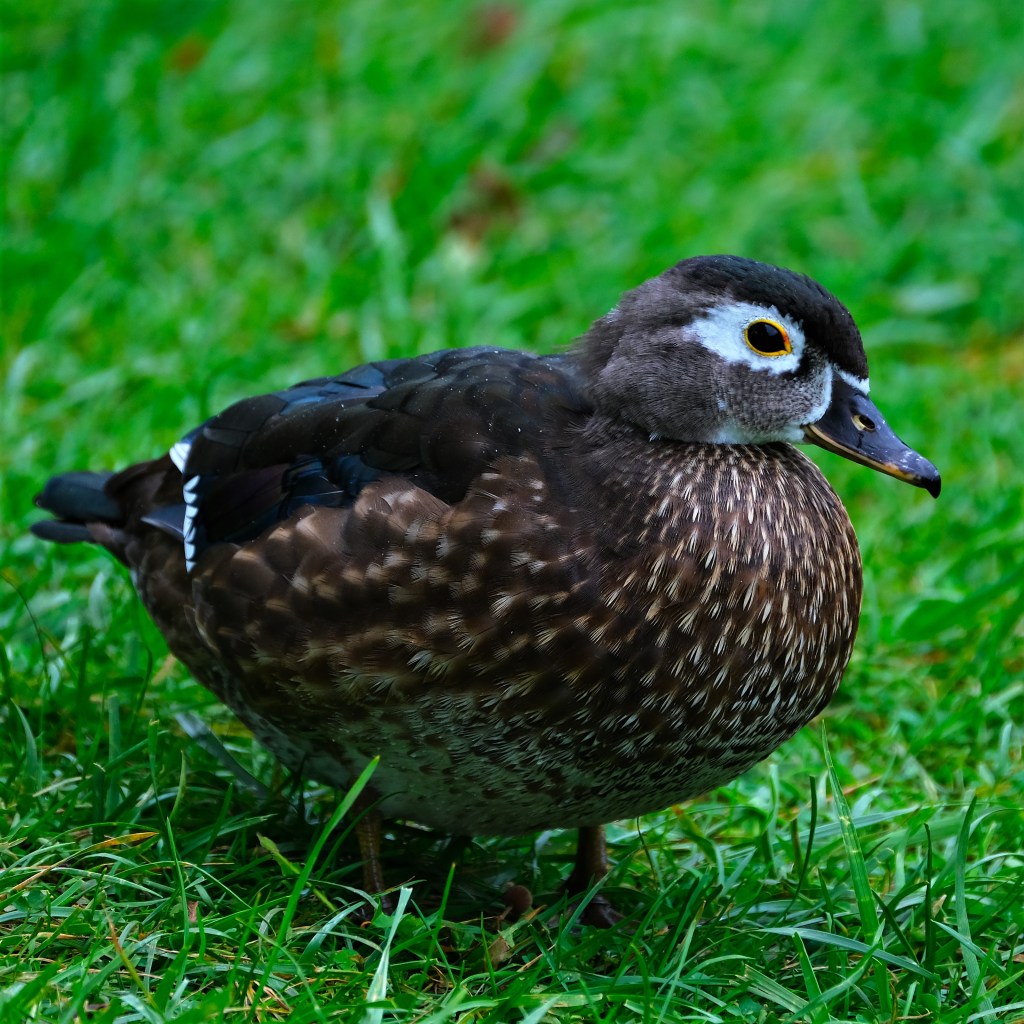I counted nine wood ducks today, and here’s a hen wondering if I’m the guy who feeds them bread from the bench on the west lawn, and if so, where’s the darn bread already.