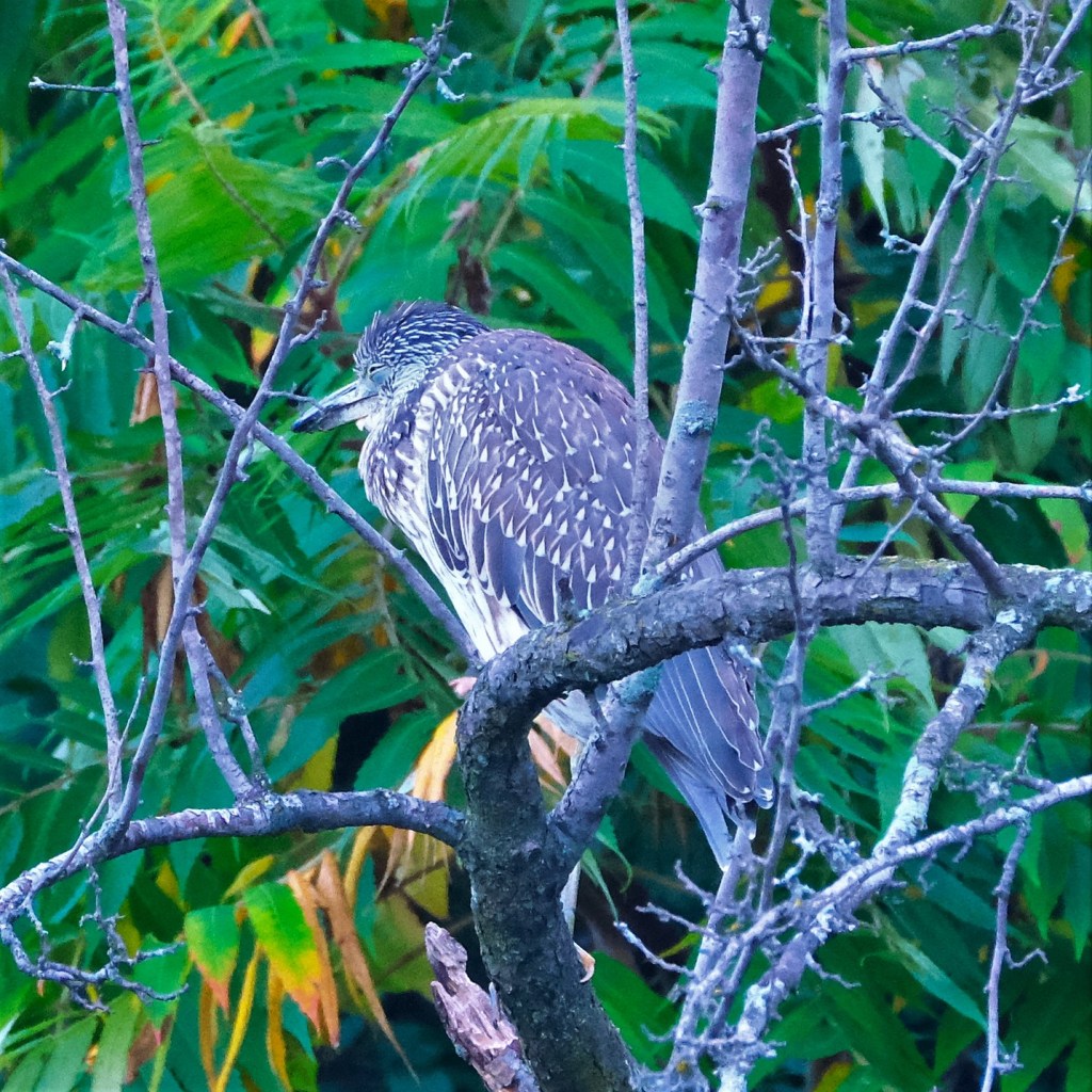The weather was perfect again, and with the nip in the morning air and some leaves beginning to change color, it’s really starting to feel like autumn in Estabrook. After finding no herons or just the sleepy night-heron at the pond recently, I was surprised to find three different herons there is morning.