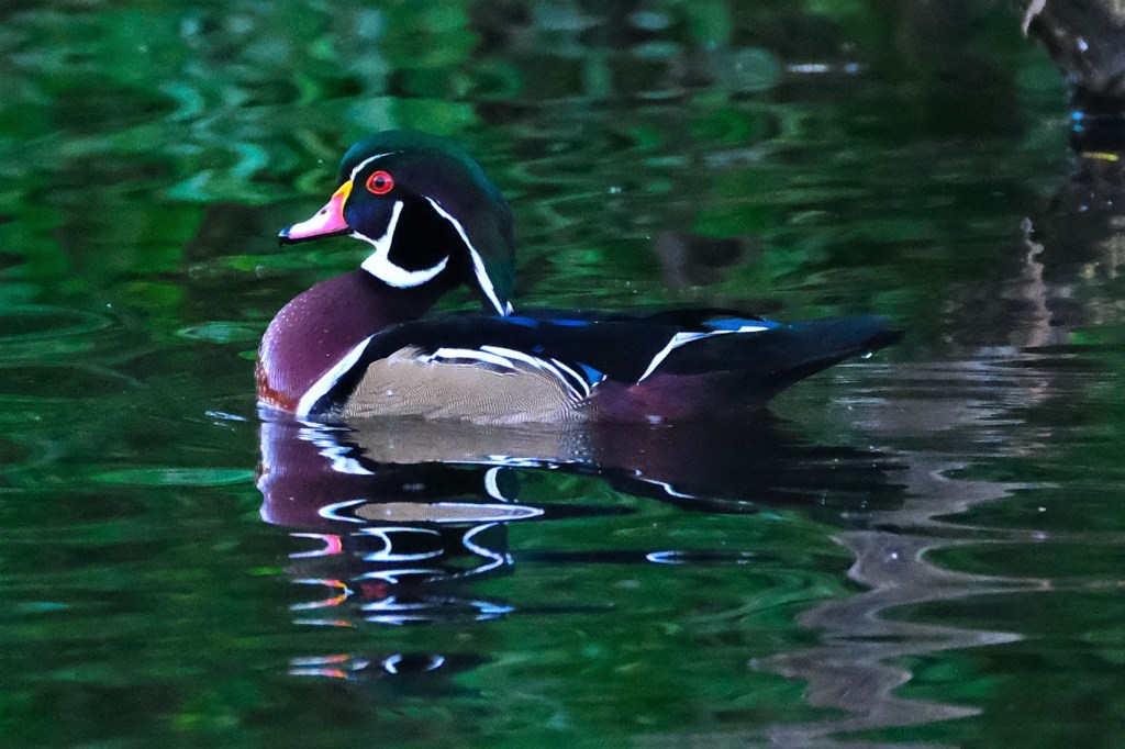 But that wasn’t even the biggest surprise! Along with the four young male wood ducks, five female wood ducks, and one mallard hen, there was a new adult male in full breeding plumage. We haven’t seen one of these in months!