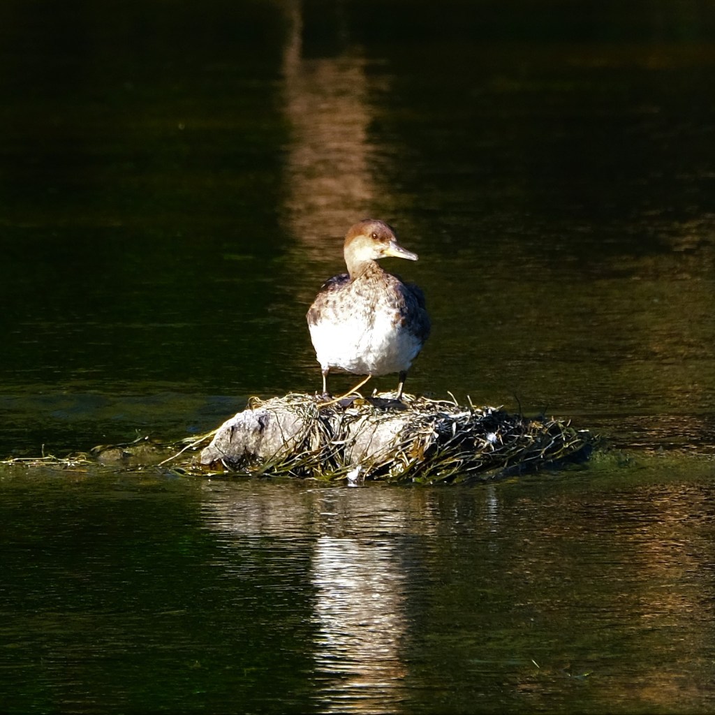 Out on the water, one of the hooded mergansers was still here and taking a break from hunting crayfish at the moment.
