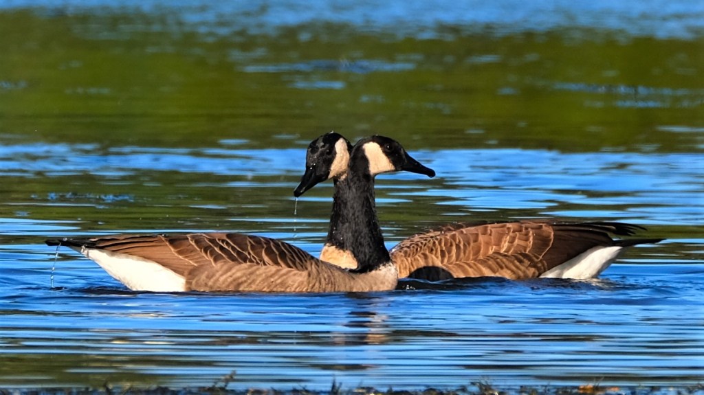 Back out on the water, a pair of Canada geese were repeatedly dipping their heads into the water as they circled each other. If it were March or April, I’d have expected them to take it to the next level. I wonder if the pair with three good wings between them, who were also there this morning, looked on and reminisced about when they were young.
